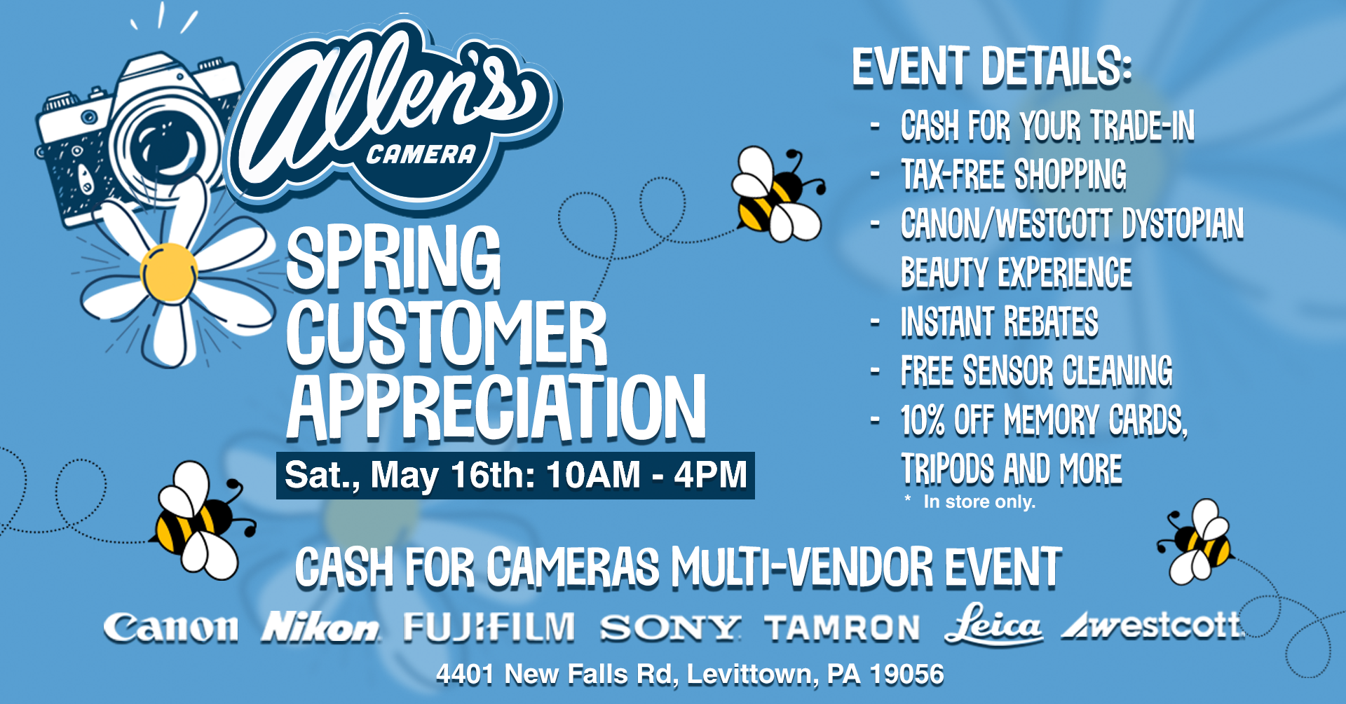 Get ready for a day full of photography fun at Allen’s Camera! Come out to meet representatives from Canon, Nikon, Sony, Fujifilm, Leica, Tamron and Westcott. This is the largest photography savings event of the year! In Store Only