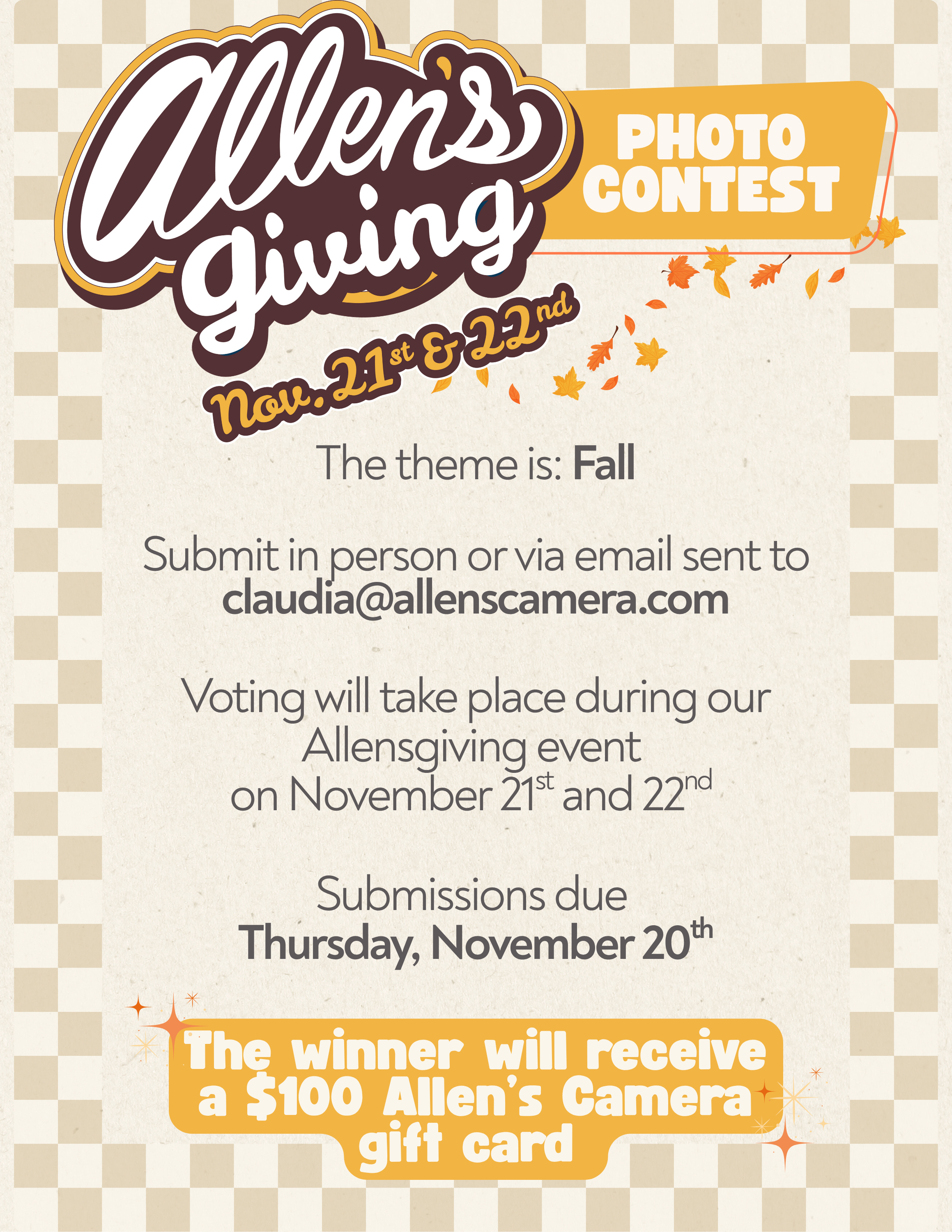 If you'd like to participate, stop into the shop any time from now until November 20th and print your best fall photo at our in-store printing kiosk, or email your submission to claudia@allenscamera.com!